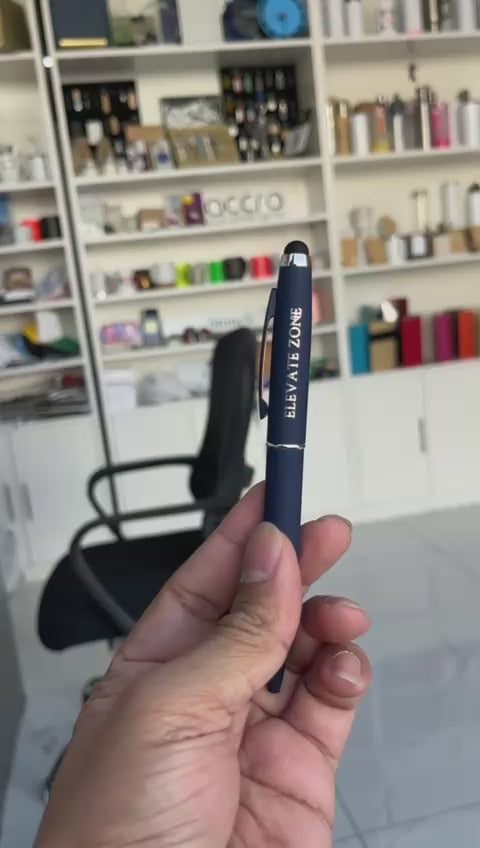 Personalized pen with a stylus and hip. They used a sturdy metallic material to build. They are hence strong and long-lasting. This pen has a silver chrome ring in the center and a multicolored metallic barrel—the color of the barrel and tip match. The pen’s whole construction is made of rubber. It is also a 2-in-1 pen. Therefore, it includes a stylus and a ball pen. The stylus is located at the pen’s top. The font is black. As a result, your cell phones can use it. In addition to the barrel, it includes a clip.